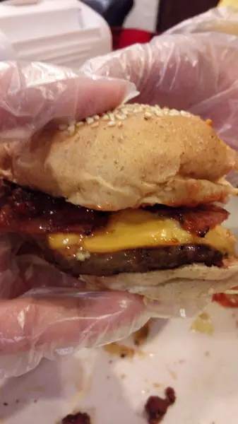 最底層的肉排是多汁不乾澀的…兩人各自戴上手扒雞手套,拿取切半後的漢堡,
