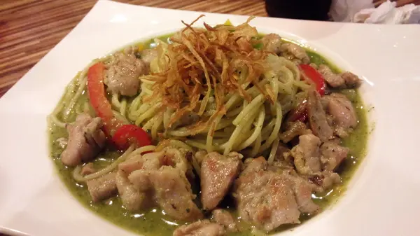 熱那亞青醬野雞麵 160元 份量十足~嫩雞肉排滿了盤子的周圍,給的很不手軟,雞肉真的很軟嫩好吃。