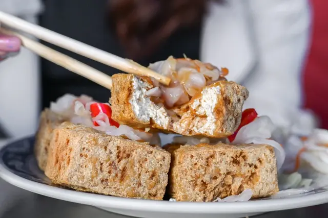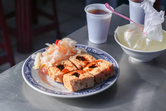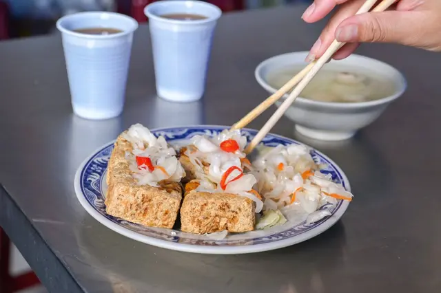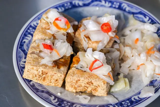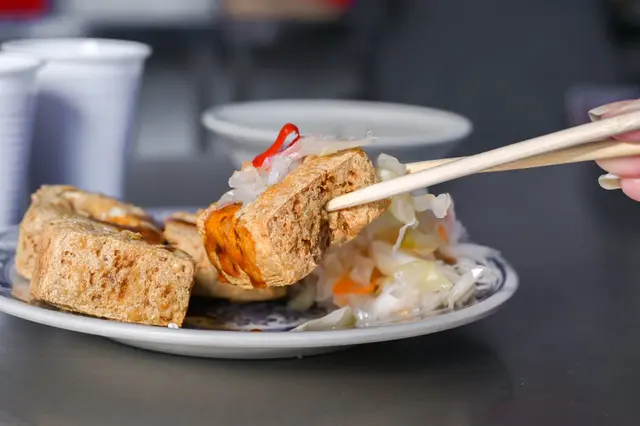 點了四塊臭豆腐,店家會將臭豆腐搓洞擠入醬油膏,附上爽脆的泡菜。