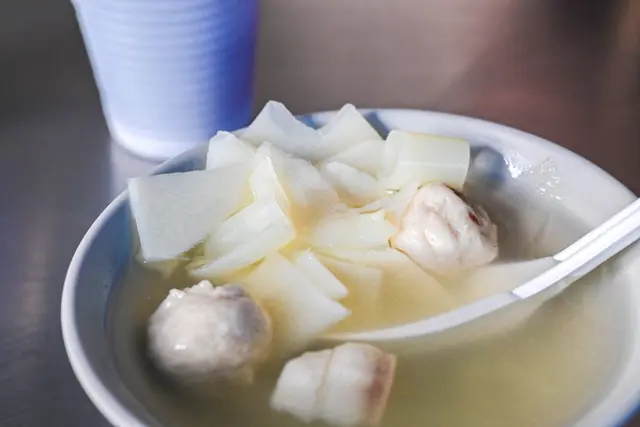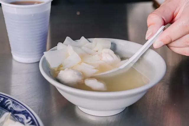 倒出來一碗滿滿的份量還裝不完,料多又實在,熱湯款項每天不一定,GOOGLE評論看到有人有喝到筍子豬血湯,當天提供的是筍子丸子湯,料多實在喝起來有25元以上的價值還無限續。