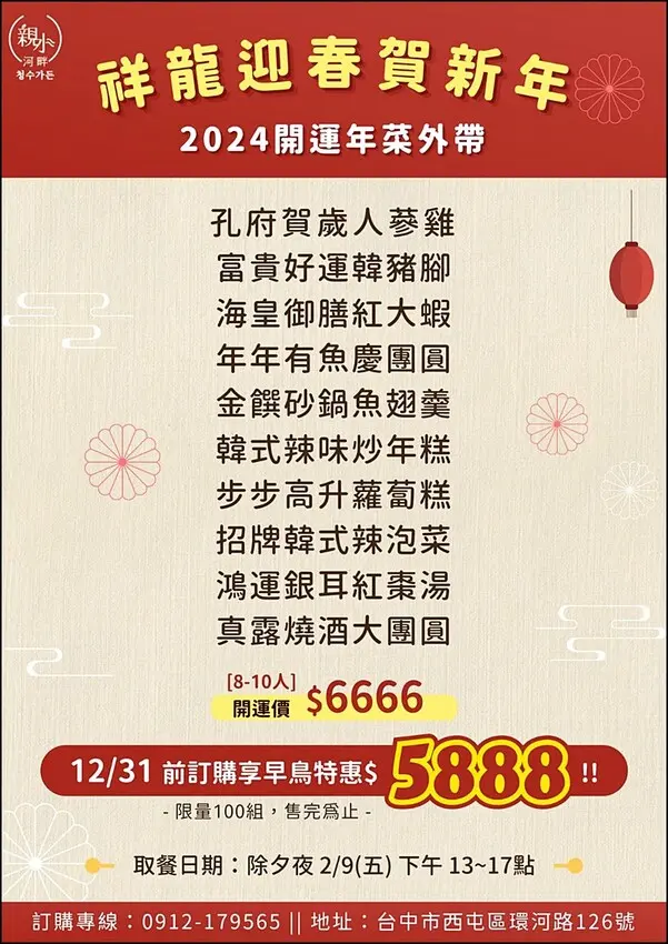 台中年菜推薦!親水河畔韓國料理開運年菜外帶,8~10人份10道台韓美味只要5888元,除夕當天新鮮現煮,下午就可自取,熱呼呼回家擺滿一整桌圍爐菜好豐盛,忙碌的家庭主婦不必辛苦在廚房奮戰幾小時,選擇外帶年菜最輕鬆,限量100組售完為止趕快預訂。