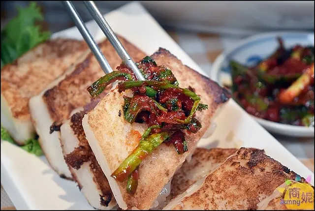 他們家的蘿蔔糕有高比例的蘿蔔絲,吃起來特別香。
