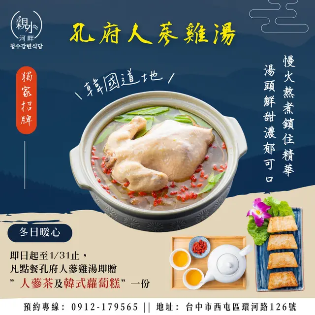 二、即日起至113/1/31,點孔府人蔘雞湯就送人蔘茶及韓式蘿蔔糕一份。