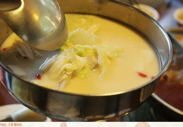 老母雞原汁熬十多小時做為基底的養生鍋,加了花旗蔘等十多種中藥材熬燉,快煮好之前會加入一些牛乳增加甜香和濃郁度,喝起來濃醇帶甘,相當好喝。