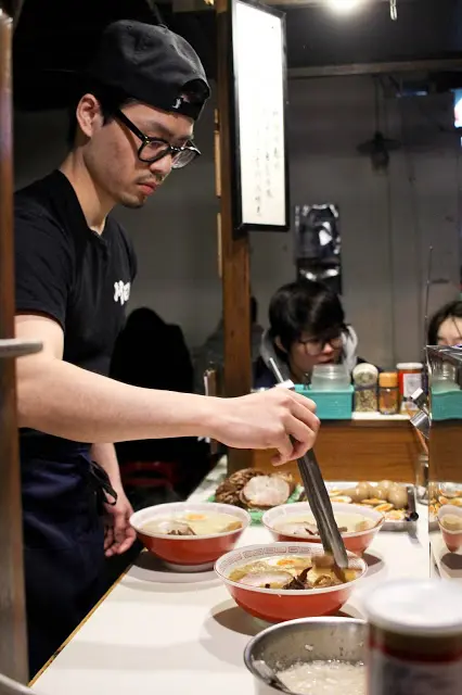 坐在角落看著店員先加入一小匙的蒜泥吧把滾燙的湯舀入碗中
