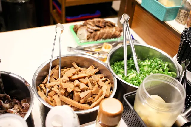 緊接著放進剛煮好的麵條不斷攪拌佐以滿滿的配料就大功告成了