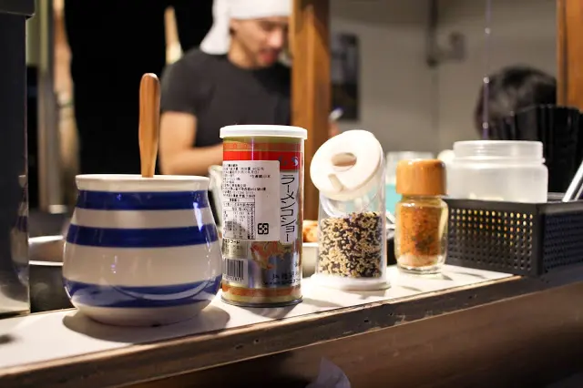 檯子上放滿了調味料不過座位實在是太小了根本無法隨意移動