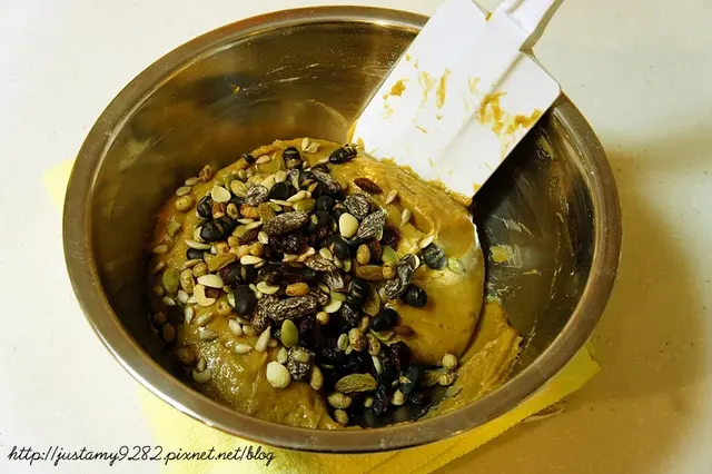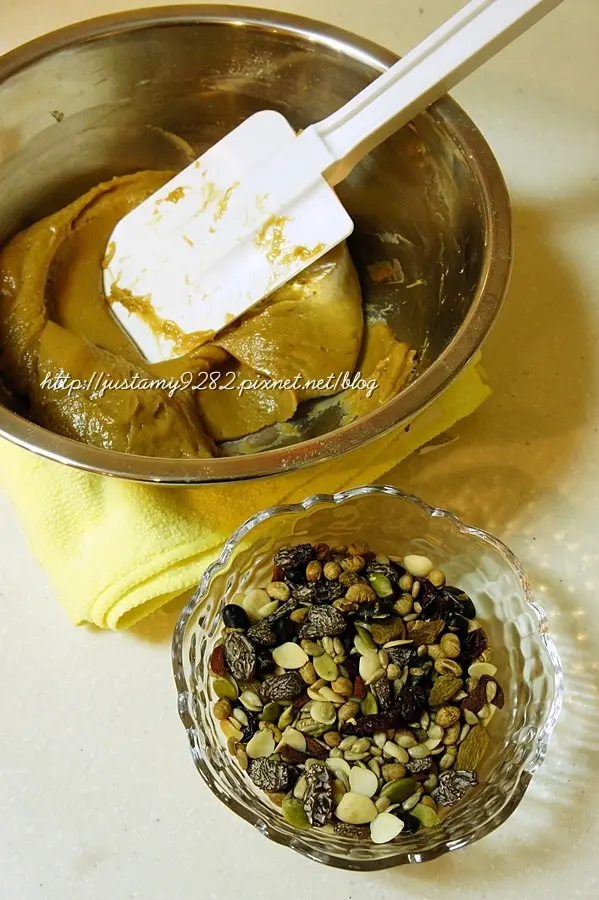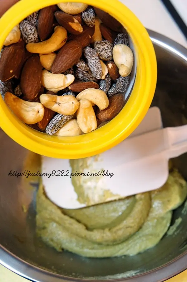 4. 接著將優の果仁倒入麵糰裡攪拌均勻