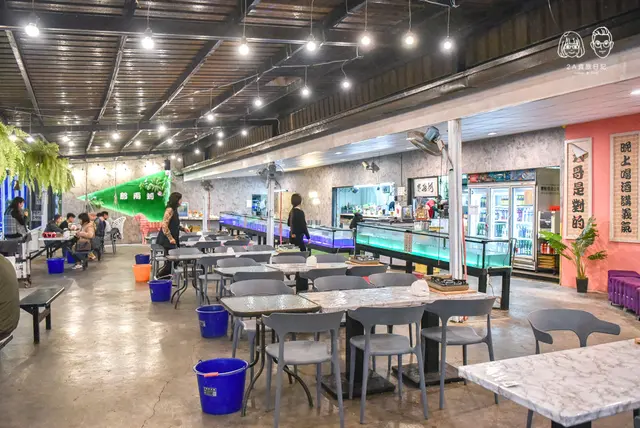 那兩蚵戶外夜景餐廳的用餐空間寬敞不壅擠,座位規劃以4~6人為主,人數較多還可以併桌,不只情侶約會,團體聚餐、公司聚餐或是來吃母親節大餐都很合適,而且每個座位底下都有個水桶讓大家裝蝦殼滿牡蠣殼,超方便!