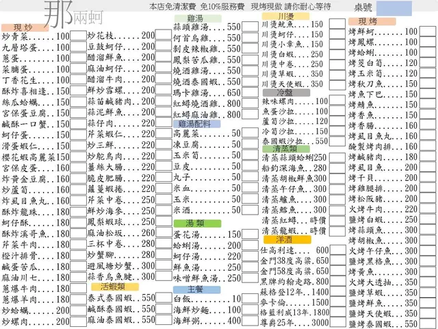 那兩蚵戶外夜景餐廳提供了各式熱炒、泰國蝦料理、雞湯、粥品、川燙海鮮、清蒸魚、烤類等多種選擇,價位落在$100~$800元之間,除此之外還有洋酒可選擇。(未滿18歲不得飲酒)