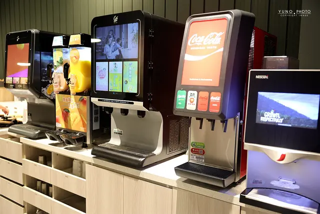 飲品區採自助式無限供應 不論是汽水控還是咖啡控 這裡通通滿足 現場有大苑子芒果冰沙、熱咖啡、可口可樂機、果汁冰沙...選擇超級多樣