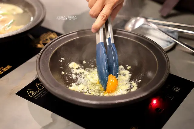 金黃澄亮的湯底 是從一鍋慢火香炒開始 使用植物奶油搭配大量蒜末爆香 接著加入鹹蛋黃拌炒出層層香氣 炒出濃郁又帶點沙沙口感的基底