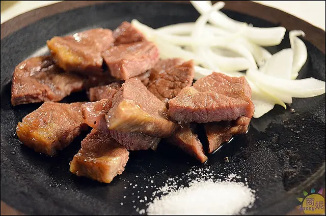 烤好的牛肉貼心剪成一口大小,沾點海鹽配洋蔥,更能吃出牛肉的甘甜
