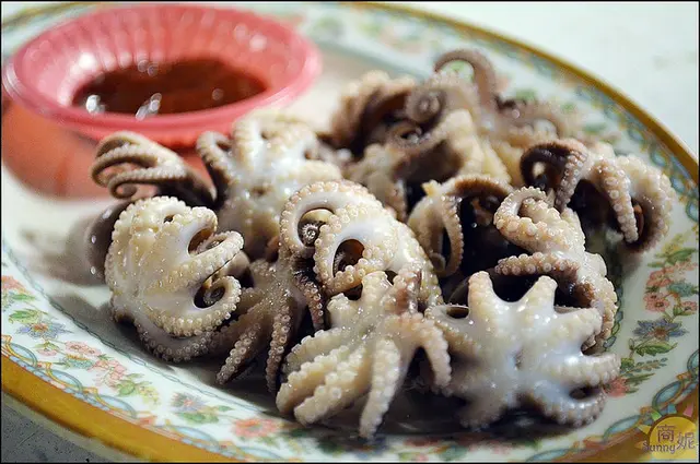 一口大小的小章魚是川燙處理,川燙處理的海鮮新鮮度一吃就知道