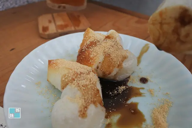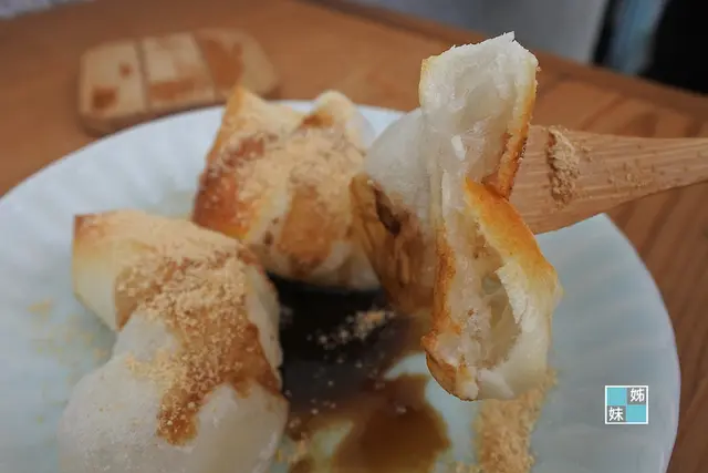 不黏膩吃起來鹹甜鹹甜,撒了黃豆粉與沾醬油醬都很搭