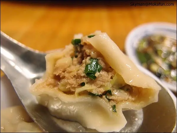 水餃皮帶一點厚度,吃起來吃的到皮的咬勁,內餡的部分是用蔥肉,單吃的話個人覺得味道稍嫌淡了點,大小的話,大口一點一口可以塞一個,正常人大概兩口吃完