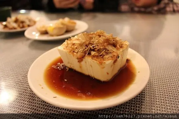 就中華豆腐淋上日式醬油後~再撒上柴魚片~