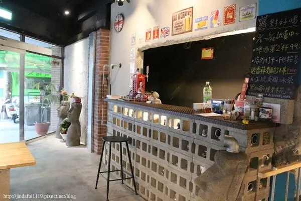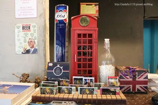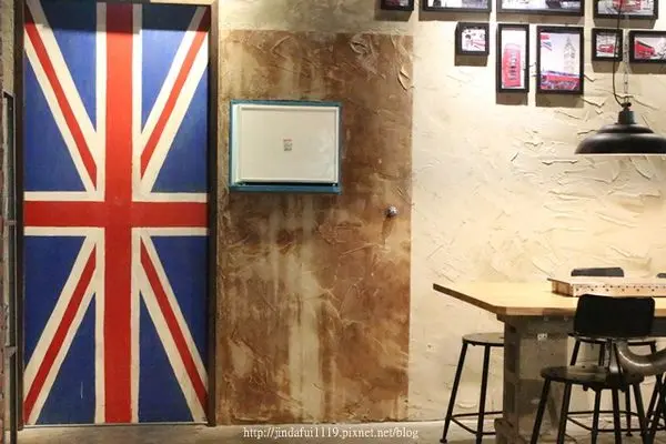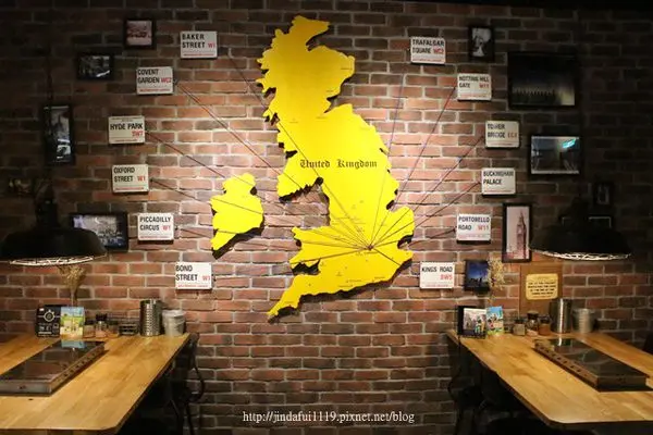 爵的空間約可容納40人,裝潢和桌椅等等幾乎都是老闆和朋友自己動手做,工業風格裡以英國的元素點綴。最吸睛的莫過於牆上的英國地圖,上頭還標示了部分知名景點(例:貝克街)和老闆當年讀書的地方(本來打"留英"可是聽起來修誇怪怪...),而四周的照片也是老闆所攝影,其中還有和老闆娘愛的照片(挑眉兩下)