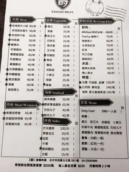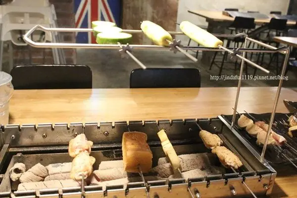 【官方介紹】遠從英國留學回來的老闆,將道地的英式工業風格帶回台灣,在老闆和他朋友的設計下,同時結合了雋永的英式氛圍以及粗獷的工業風格,另外還特別使用空心磚做為桌架、大片的水泥佈置牆面,最後再將亮眼的英國地圖以及從英國攜回的路名鐵牌放在紅磚主牆上裝飾點綴!如此用心,爵 旋轉串燒 炭烤希望能為每日都在奔波忙碌的人們,提供一處得以放鬆享食的好地方! 店內每張桌子皆會提供烤爐,讓顧客僅需簡單地在爐上放上蔬菜串、肉串等餐點,其食材就會藉由內建的鍊條帶動而自動旋轉,無需再另外放上烤網,就能將食材烤至均勻,不易燒焦,品嚐起來也較為健康、美味。店內除了配置特殊的烘烤設計之外,【爵 旋轉串燒 炭烤】為了提供最新鮮的食材,其餐點菜色皆是採手工方式處理,每日採限量供應,特別是美國安格斯牛肉,嚴選最高等級的Prime和第二等的Choice,完全不經過二次加工,運用火烤手法將肉汁完美封住,以食材本身原味上桌,讓每一口,都是滿嘴濃郁的牛肉滋味!由於老闆在食材品質控管上較為嚴格,因此在雞肉、豬肉的料理上不加以用醃料蓋過原味,讓顧客能品嚐到肉質本身的鮮嫩。而別於一般店家少見美味菜色的「炭烤櫛瓜」、「香蕉」、「蒜頭」,不僅在店內深獲顧客好評之外,清爽的風味更經過烤製後,散發出獨特的迷人好味,讓肉品不再專美於前,一次滿足顧客多變的味蕾。除了烤物之外,店內富有知名的「Whittard英式水果冰茶」、「可倫堡1664」、「豪格登白啤酒」、「瑞典夏日蜜蘋果啤酒」、「台灣荔枝啤酒」等多樣飲品,為您在盡情品嚐美味之餘還有清涼飲品增添滋味。
