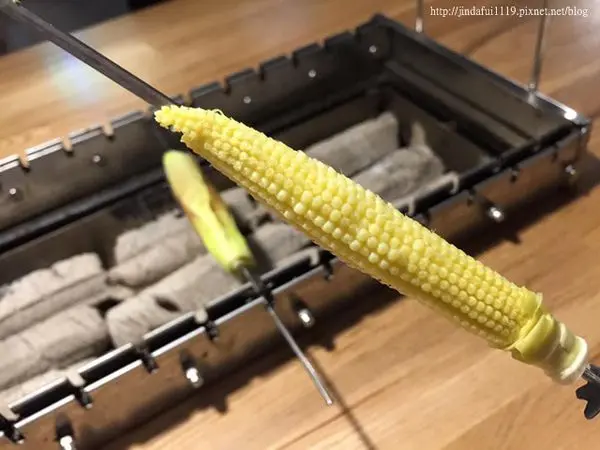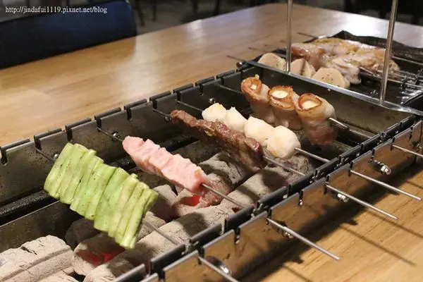 爵 旋轉串燒 炭烤最大的特色就是要自己烤但也不全然是真的自己烤(?),每支籤上都有一個齒輪,那不是裝飾而是有功用的,烤爐上有一條軌道,將串燒固定上去,串燒們便會隨著齒輪自行轉動。我們只要注意放了多久,觀察顏色的變化即可,這完全是懶人如我的福音阿哈哈哈哈哈,我才懶得全程灌注的自己烤,我將串燒一一排上去後就轉頭和同行人聊起來了,任憑串燒們在烤爐上不停翻轉。老闆說油脂較多的要放邊邊,這樣抽風才抽得快,是的,爵的抽風系統不是像大多的燒烤店都是在頭頂上,老闆標榜在爵可以輕輕鬆鬆烤肉且身上不會多了濃厚的油煙味,來去不留痕,所以是個適合"偷吃"的地方XD