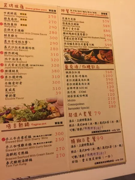 窯烤披薩,塔吉熱鍋,排餐,葡萄酒/微醺飲品