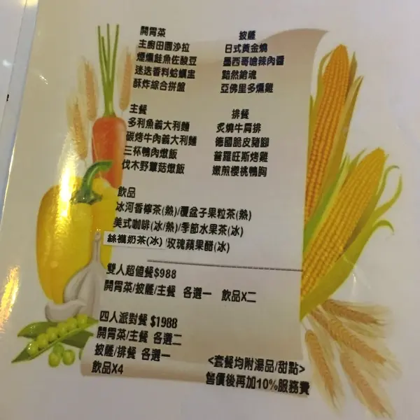 品項 內容 數量 開胃菜 煙燻鮭魚佐酸豆 任選1 酥炸嫩雞柳搭脆薯 酒香蛤蜊佐迷迭香 凱薩雞肉沙拉 排餐 德國脆皮豬腳 任選1 櫻桃鴨胸佐藍莓醬汁 普羅旺斯烤半雞 「排餐」系列皆附沙拉、湯品、麵包、甜點、飲品 各1份 義大利麵&燉飯