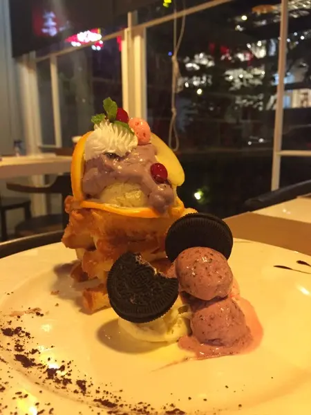 上面擠上鮮奶油,冰淇淋 一旁還有三大球冰淇淋 Oreo
