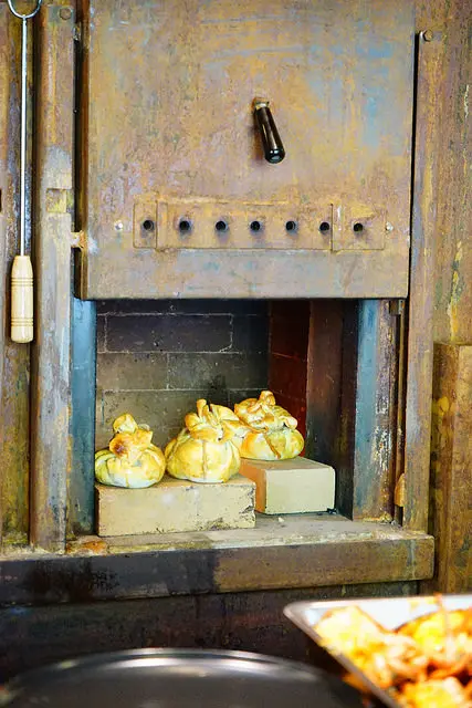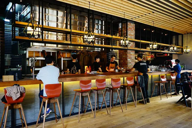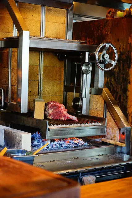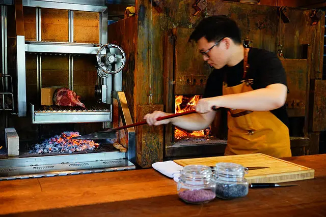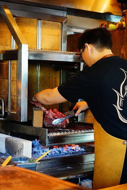 有看到爐子右上方有一個像旋轉盤的東西嗎?他可以依照牛肉、豬肉、海鮮、甜點等不同的餐點品項彈性變換高度及最佳的火侯溫度,而坐在吧檯前的顧客可以全程觀賞廚子們華麗而原始的烹調技術,只是坐在吧檯前面可能會有點熱就是了
