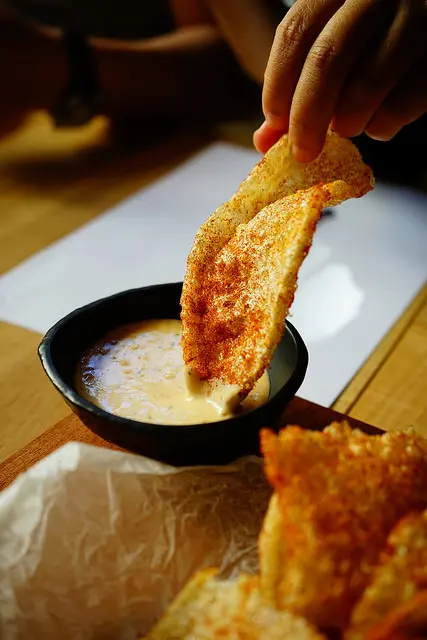 吃起來很像蝦餅的炸豬皮,爽口輕脆,一點也不油,搭配自製微酸的美奶滋、紅蔥頭、洋蔥沾醬,讓人一口接一口超涮嘴,一下子盤底朝天