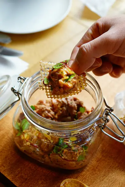不曉得叫煙燻牛肉塔塔還是牛肉韃靼?一打開玻璃瓶就先聞到好安撫人心的煙燻香氣