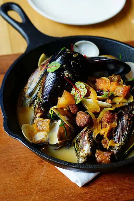 餐酒館裡最常出現的一道白酒蛤蜊,但這裡的白酒蛤蜊很不一樣唷!多了香茅與檸檬草的南洋風味,Jimmy主廚說因為他是來自新加坡的孩子,所以想幫這道料理加上一點家鄉味,上面還有一點台味,是炸過的三層肉,兩道程序烹調出來的白酒蛤蜊口感層次更加豐富