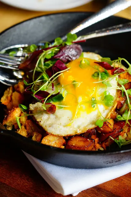 將半熟蛋刺破滑落下來當成潤滑的sauce,混著煎的酥脆的麵包丁與馬鈴薯吃,滿足感和飽足感都有了,這道料理感覺很早午餐耶!