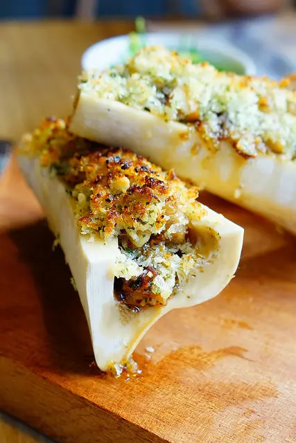 將骨髓、燉牛尾、章魚塞入牛骨裡頭灑上麵包粉去烤的金黃