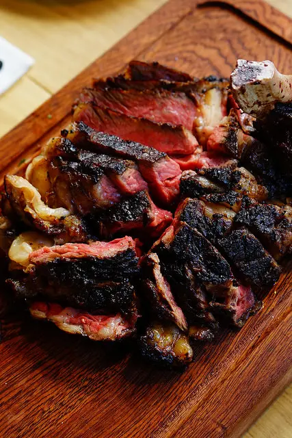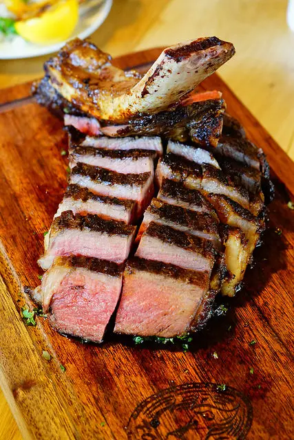 份量驚人超豪邁的肋眼牛排,建議五分熟的口感最柔嫩,大火炭烤讓表層烤的又酥又脆,用的是埔里的荔枝木和龍眼木,香氣十足,這裡的餐點都算是大份量的,很適合多人分食