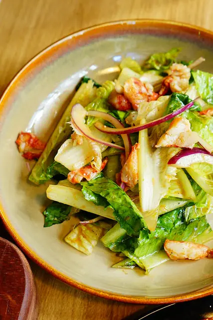 另一道配菜龍蝦蘿蔓生菜沙拉,好豪華,還有一道配菜我竟然漏照真該死,那道配菜我覺得超級好吃的說,是用覆盆子醋、蘋果醋和香檳醋醃製而成的三色甜菜根,搭配牛排格外清爽不膩,單吃也好甜美開胃