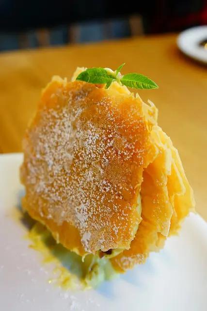 一層層的千層派是前所未有的酥脆口感,他不止酥脆而且還非常有層次,裡頭的餡有點像檸檬餡加培根的燻香,嚐起來鹹鹹甜甜卻又沒有違和感,有台味卻又有更多的法味,這個甜點帶著香酥脆,檸檬餡清香不膩,我自己絕對可以吃上一份