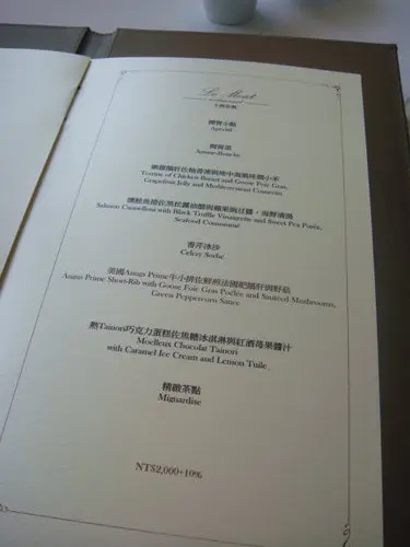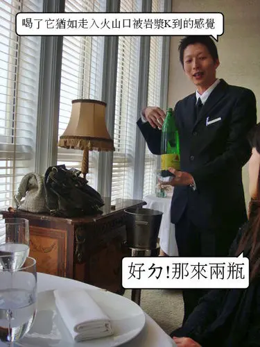 這家法式料理有侍酒師耶!哇!真想請他表演夢幻醒酒術或者朗誦一下喝完這個酒的感覺(對紅酒有興趣的人可以去看神之雫,粉好看唷!)可惜我們沒有點酒,但是他們推薦我們氣泡礦泉水,我一向不愛喝有氣的東東,所以興趣缺缺,但是我看小謙很喜歡,每次他都會點氣泡礦泉水