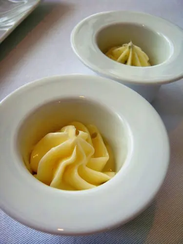 嚐上一口有一種QQ的熟悉感覺,原來是西谷米耶!香醇的海膽慕斯,有個濃濃的鮮味,小謙說很腥,什麼腥味啦!傻呼呼的,是海潮味啦!因為夠濃郁,用來抹在麵包上,也很美味唷!