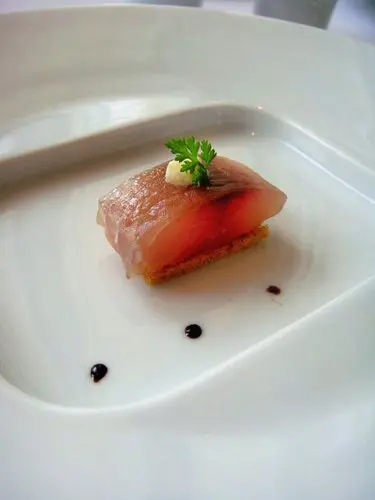 我的開胃菜檸檬漬竹筴魚佐香料酥片,因為我不敢吃生魚片,所以沒有吃,給小謙享用了,聞了一下,真的有股淡淡的檸檬清香,小謙說甜美而且沒腥味,魚肉很鮮美,我比較愛前面那三顆陳年老醋與魚下面的麵包酥片