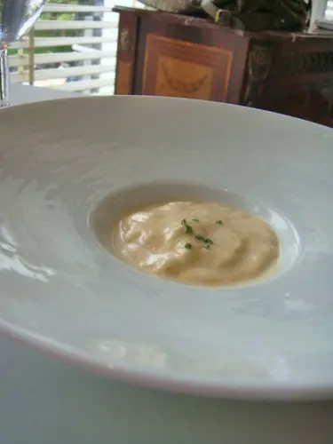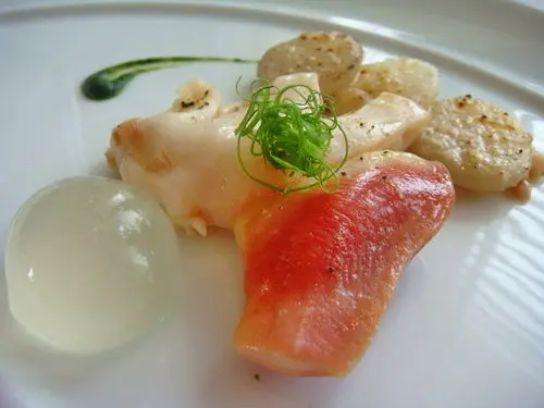 小謙的另一道開胃菜薄烤北寄貝佐冬蔥醬與水芹葉泥,看看那肥厚的北寄貝,那一抹紅,真是美啊!白色部分與紅色部分口感不同,一個Q嫩,一個爽脆,整個搭起來就是甜美無比,後面那個可不是干貝,是烤馬鈴薯片,如果是干貝該有多好