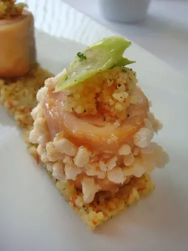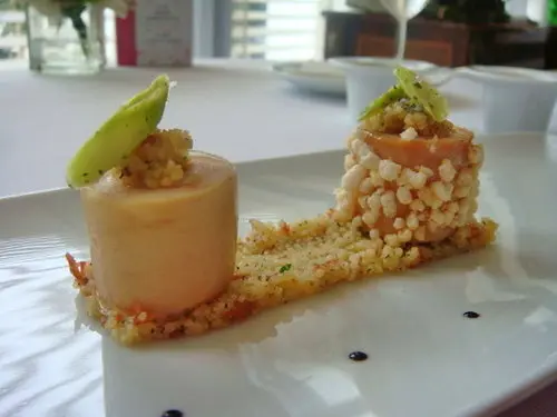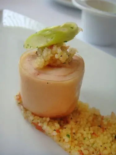 這是我的另一道開胃菜嫩雞鵝肝佐柚香凍與地中海風味悶小米,看起來就好漂亮唷!雖然很捨不得,但是還是要吃掉你~~~~~~
