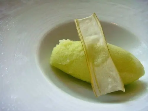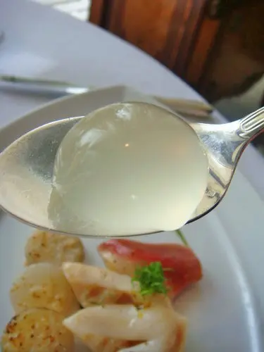 猜猜看,這顆透明水晶球很漂亮吧!是裝飾品?還是吃的呢?這個就是目前很有名的分子廚藝料理Molecular Gastronomy簡單的說,就是針對傳統廚藝手法與料理形貌予以顛覆、解構、重組,創造出全新的味覺、口感與飲食享樂體驗,很有意思吧!這顆是用寒天包裹著蘆筍汁,可不能切開來吃唷!要一口吃下去