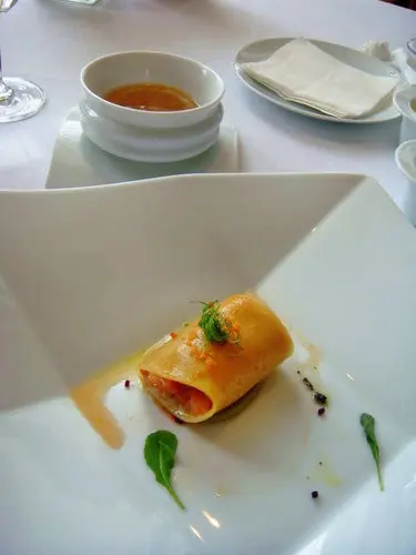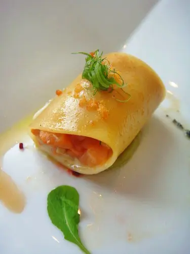外層包裹的手工麵皮很Q很有口感,侍者說是什麼來著,我忘了,搭配煙燻鮭魚也很美味