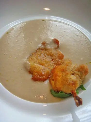 小謙的酥炸鵪鶉佐蔬菜丁與鮮菇濃湯,濃湯是分開放的,要喝時才倒到碗裡頭的,所以整個保有鵪鶉的酥脆度,這個濃湯有加了三種以上的菇與牛肝菌,我很愛牛肝菌那特有的濃郁味道,所以我比較愛這款湯