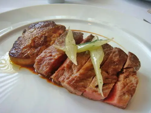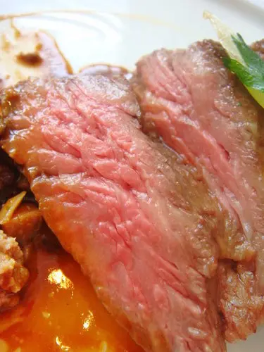 侍者建議牛小排五分熟來食用,你看看粉紅色澤裡泊泊流出來的肉汁,脂肪紋路分佈適中,肉質因為脂肪含量高,所以吃起來比較juice,比較柔軟,如硬要說個缺點,就是,牛小排肥美,鵝肝也肥美,會讓我變胖子啦!哈哈哈!