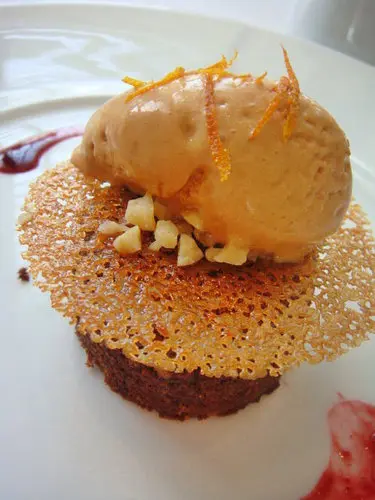 我的甜點熱巧克力蛋糕佐焦糖冰淇淋與紅酒莓果醬汁,蛋糕裡頭有熱熱的巧克力醬汁會流出來,搭配冰淇淋享用,一冷一熱卻互相搭配的的完美滋味,中間那層薄薄的糖更有畫龍點睛之妙,視覺味覺都令人滿意極了