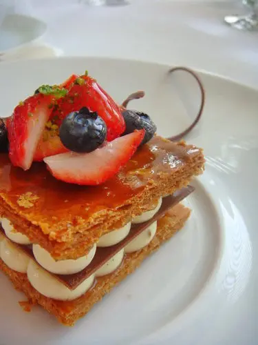 可是比起來,我還是更愛小謙的甜點草莓玫瑰千層酥,因為我很愛千層酥皮的感覺,而且它裡面的custard奶油醬竟然是玫瑰的香味,我愛死玫瑰了,吃這個甜點讓我好有幸福的感覺啊!上面搭配有新鮮草莓與藍莓,套一句很俗的台詞,這就是酸酸甜甜的戀愛滋味吧!大大的滿足