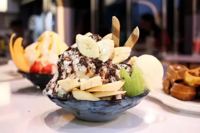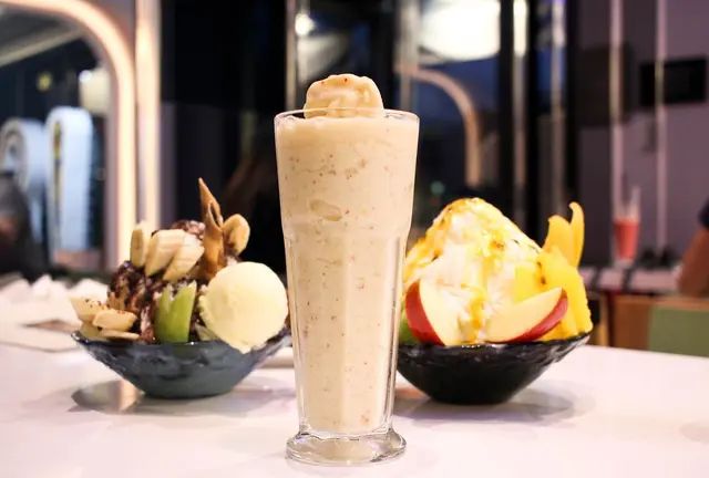 牛奶冰磚灑上巧克力粉以黃色香蕉點綴,巧克力粉如oreo的口感。