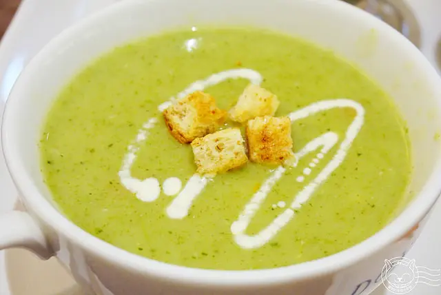 附餐濃湯是綠蓉巧達濃湯,翠綠的顏色是菠菜的原色,