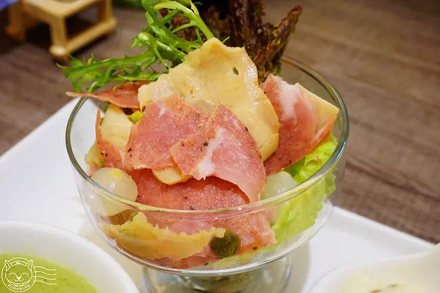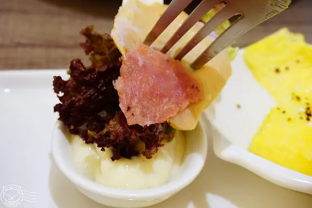 涼涼的火腿搭配小塊的生菜、酸豆、醃小洋蔥,再沾上店家特調芥子沙拉醬,
